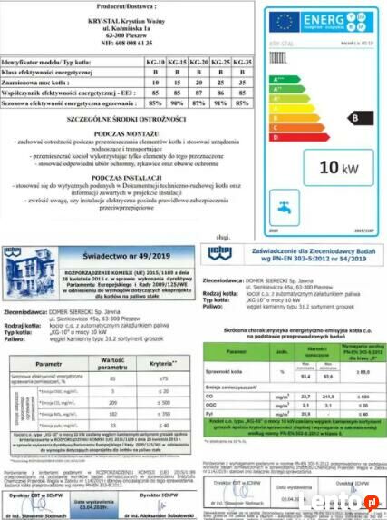 * Certyfikat potwierdzający normę w jakiej kocioł został wyprodukowany,